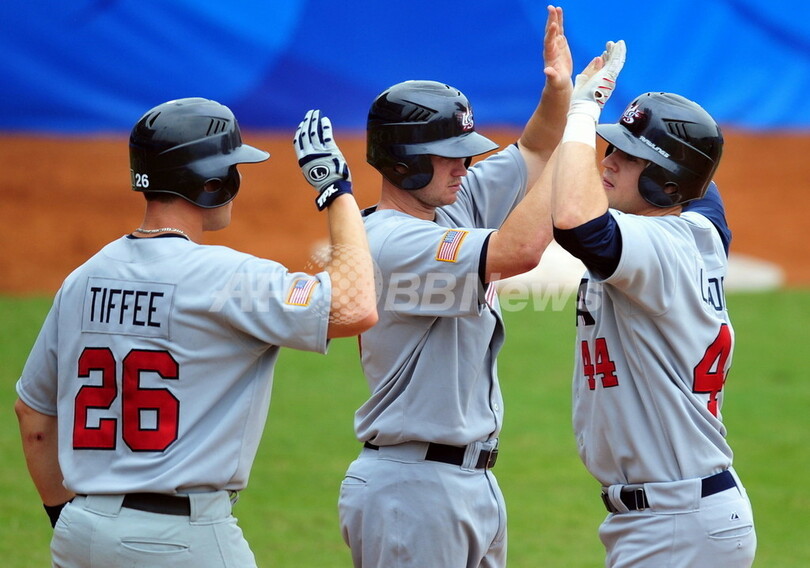 五輪 米国 雨天コールドでオランダ下し初勝利 2008年8月14日 20:40 発信地:北京/中国 [ 中国・台湾 中国 ] このニュースをシェア ‹ › ❮ 1/3 ❯ 4回表に3点本塁打を放ち、テリー・ティフィー(%%Terry Tiffee%%、左)、マット・ブラウン(%%Matt Brown%%、中央)とハイタッチを交わす米国のマット・ラポルタ(%%Matt LaPorta%%)。(2008年8月14日撮影)(c)AFP/Frederic J. BROWN 画像作成中 ! 【8月14日 AFP】北京五輪第7日、野球・一次リーグ、オランダ対米国。試合は米国が7-0の8回雨天コールドでオランダを下し、大会初勝利を挙げ通算成績を1勝1敗とした。(c)AFP 五輪 一覧へ> メディア・報道関係・法人の方向け 写真・動画 購入のお問合せ>