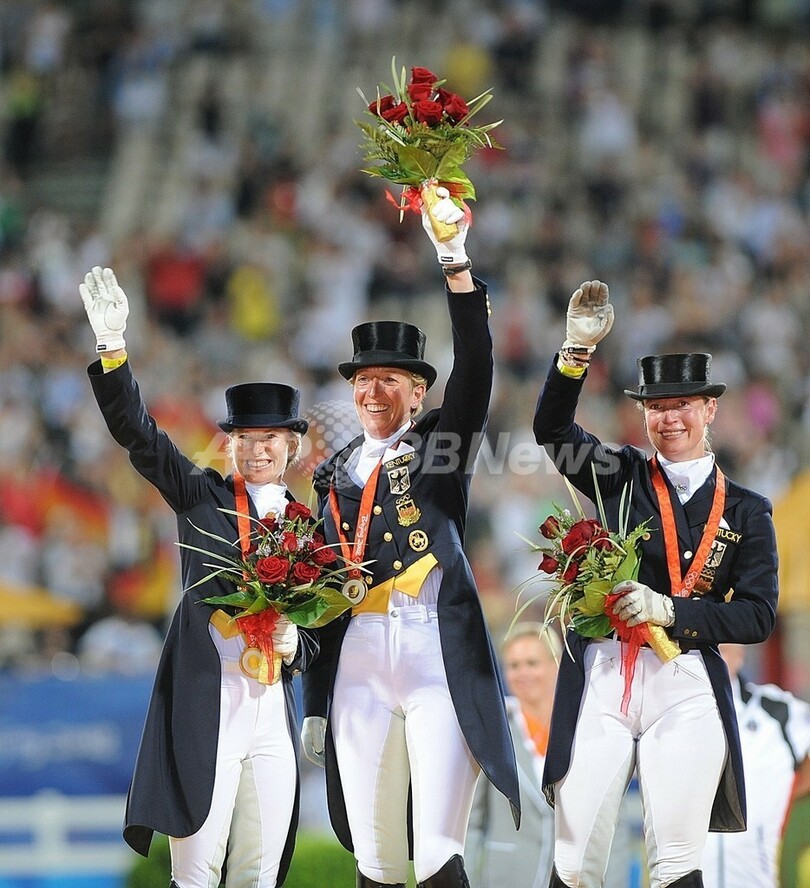 五輪 ドイツ 馬場馬術団体グランプリで金メダル獲得 2008年8月15日 10:27 発信地:香港 このニュースをシェア ‹ › ❮ 5/5 ❯ 金メダルを獲得し表彰台で喜びを表すドイツの(左から)ナディネ・カペルマン(%%Nadine Capellmann%%)、ハイケ・ケマー(%%Heike Kemmer%%)、イザベル・ウェルト(%%Isabell Werth%%)。(2008年8月14日撮影)(c)AFP/MIKE CLARKE 画像作成中 ! 【8月15日 AFP】北京五輪第7日、馬場馬術団体グランプリ決勝。ドイツは計72.917点を記録し、金メダルを獲得した。また、銀メダルは計71.750点を記録したオランダが、銅メダルは計68.875点を記録したデンマークが獲得した。(c)AFP 五輪 一覧へ> メディア・報道関係・法人の方向け 写真・動画 購入のお問合せ>