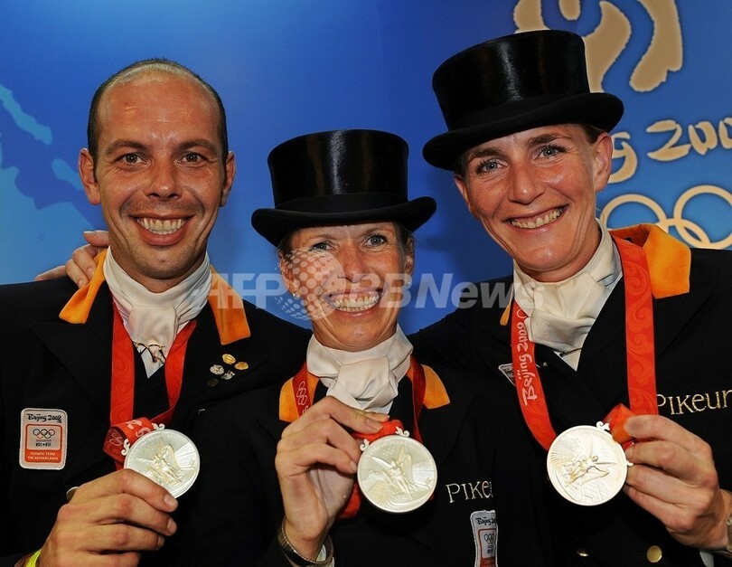 五輪 ドイツ 馬場馬術団体グランプリで金メダル獲得 2008年8月15日 10:27 発信地:香港 このニュースをシェア ‹ › ❮ 3/5 ❯ 銀メダルを掲げるオランダの(左から)ハンスペーター・ミンデルフート(%%Hans Peter Minderhoud%%)、アンキー・ファンフルンスフェン(%%Anky van Grunsven%%)、インケ・シェレケンスバルテルス(%%Imke Schellekens-Bartels%%)。(2008年8月14日撮影)(c)AFP/DAVID HECKER 画像作成中 ! 【8月15日 AFP】北京五輪第7日、馬場馬術団体グランプリ決勝。ドイツは計72.917点を記録し、金メダルを獲得した。また、銀メダルは計71.750点を記録したオランダが、銅メダルは計68.875点を記録したデンマークが獲得した。(c)AFP 五輪 一覧へ> メディア・報道関係・法人の方向け 写真・動画 購入のお問合せ>