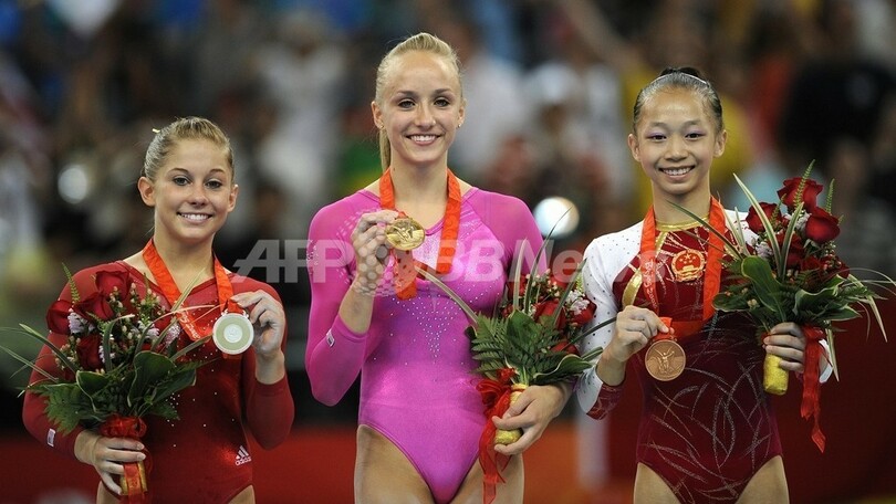 【8月15日 AFP】北京五輪第8日、体操女子・個人総合決勝。米国のナスティア・リューキン(Nastia Liukin)は、合計63.325点を記録して金メダルを獲得した。
