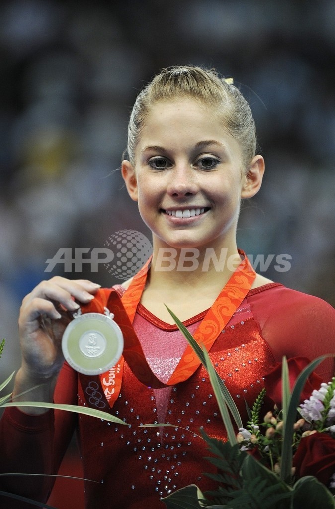 また、銀メダルは62.725点を記録した同じく米国のショーン・ジョンソン(Shawn Johnson)が、銅メダルは62.650点を記録した中国の楊伊琳(Yang Yilin)が獲得した。(c)AFP
