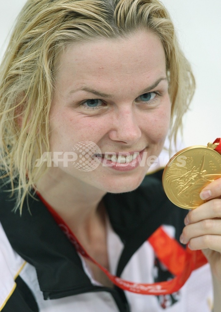 【8月17日 AFP】(写真追加)北京五輪第10日、競泳・女子50メートル自由形決勝。ドイツのブリッタ・シュテフェン(Britta Steffen)は、五輪新記録となる24秒06を記録して、金メダルを獲得した。シュテフェンは同100メートルとの2冠を達成した。