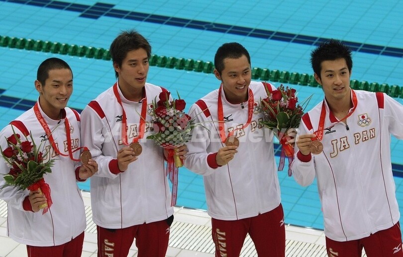 五輪 日本人選手 日本 男子4x100メートルメドレーリレーで銅メダル 2008年8月17日 14:52 発信地:北京/中国 [ 中国・台湾 中国 ] このニュースをシェア ‹ › ❮ 1/2 ❯ 北京五輪競泳・男子4x100メートルメドレーリレーで銅メダルを獲得し、メダルを手にポーズをとる(左から)佐藤久佳、藤井拓郎、北島康介、宮下純一。(2008年8月17日撮影)(c)AFP/GREG WOOD 画像作成中 ! 【8月17日 AFP】北京五輪第10日、競泳・男子4x100メートルメドレーリレー決勝。日本(宮下純一Junichi Miyashita、北島康介Kosuke Kitajima、藤井拓郎Takuro Fujii、佐藤久佳Hisayoshi Sato)は、3分31秒18の日本新記録で3位に入り、銅メダルを獲得した。(c)AFP 五輪 一覧へ> メディア・報道関係・法人の方向け 写真・動画 購入のお問合せ>