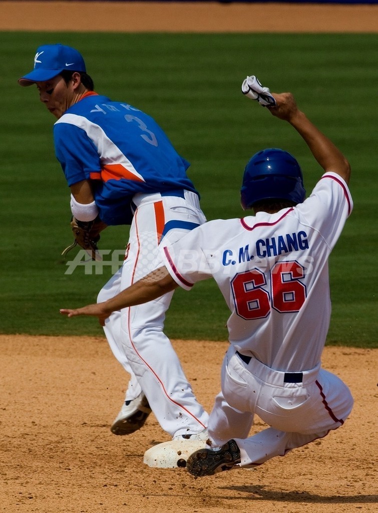 五輪 韓国 接戦で台湾を下し5連勝 2008年8月18日 17:34 発信地:北京/中国 [ 中国・台湾 中国 ] このニュースをシェア ‹ › ❮ 5/8 ❯ 二塁上で台湾の張建銘(%%Chang Chien-Ming%%、ジャン・ジェンミン、右)をフォースアウトに仕留める韓国の高永民(%%Ko Youngmin%%、コ・ヨンミン)。(2008年8月18日撮影)(c)AFP/Omar Torres 画像作成中 ! 【8月18日 AFP】北京五輪第11日、野球・一次リーグ、台湾対韓国。試合は韓国が9-8で台湾を下し、連勝を5に伸ばした。(c)AFP 五輪 一覧へ> メディア・報道関係・法人の方向け 写真・動画 購入のお問合せ>