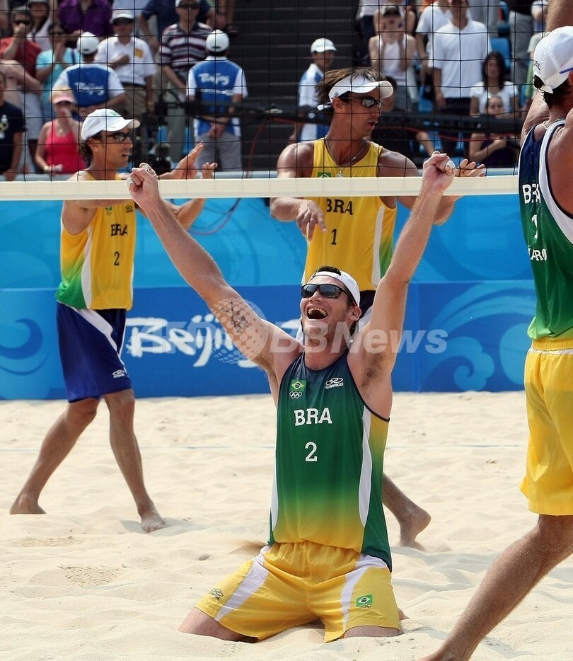 五輪 アラウジョ/ルイス組 ビーチバレー・男子決勝進出 2008年8月20日 14:29 発信地:北京/中国 [ 中国・台湾 中国 ] このニュースをシェア ‹ › ❮ 2/2 ❯ 勝利に歓喜するマルシオ・アラウジョ(中央)。(2008年8月20日撮影)(c)AFP/THOMAS COEX 画像作成中 ! 【8月20日 AFP】北京五輪第13日、ビーチバレー・男子準決勝。ブラジルのマルシオ・アラウジョ(Marcio Araujo)/ファビオ・ルイス(Fabio Luiz)組は、ブラジルのリカルド・サントス(Ricardo Santos)/エマヌエル・レーゴ(Emanuel Rego)組と対戦。アラウジョ/ルイス組はセットカウント2-0(22-20、21-18)でサントス/レーゴ組に勝利し、決勝進出を決めた。(c)AFP 五輪 一覧へ> メディア・報道関係・法人の方向け 写真・動画 購入のお問合せ>