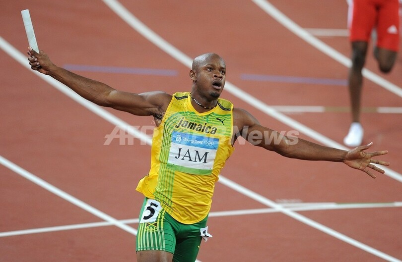 【8月22日 AFP】(23日写真追加)北京五輪第15日、陸上・男子4x100メートルリレー決勝。ジャマイカ(ネスタ・カーター(Nesta Carter)、マイケル・フレイター(Michael Frater)、ウサイン・ボルト(Usain Bolt)、アサファ・パウエル(Asafa Powell))は、1993年8月に米国が記録した37秒40の世界記録を15年ぶりに更新し、37秒10で金メダルを獲得した。この結果、ジャマイカのウサイン・ボルトは、同大会で男子100メートル、200メートルに続き3個目の金メダルを獲得した。