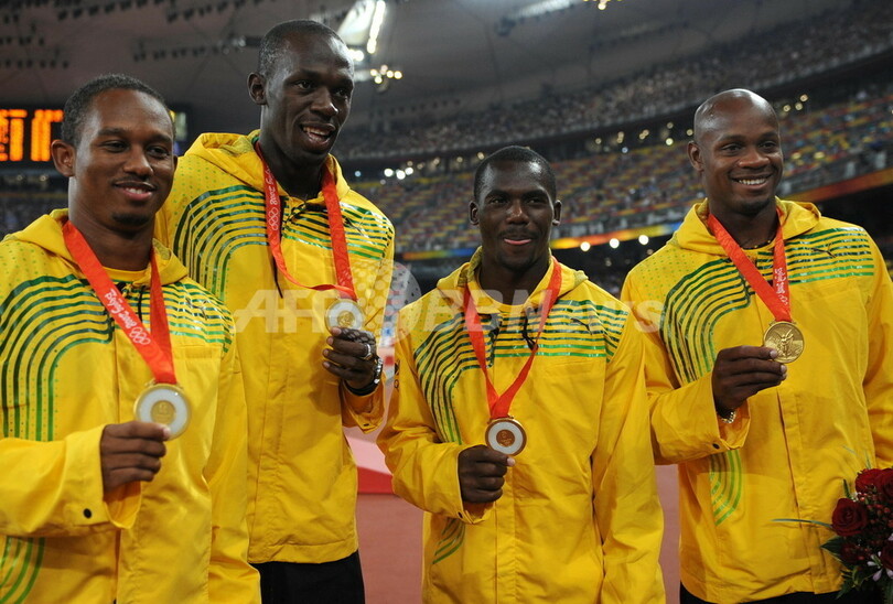 【8月22日 AFP】(23日写真追加)北京五輪第15日、陸上・男子4x100メートルリレー決勝。ジャマイカ(ネスタ・カーター(Nesta Carter)、マイケル・フレイター(Michael Frater)、ウサイン・ボルト(Usain Bolt)、アサファ・パウエル(Asafa Powell))は、1993年8月に米国が記録した37秒40の世界記録を15年ぶりに更新し、37秒10で金メダルを獲得した。この結果、ジャマイカのウサイン・ボルトは、同大会で男子100メートル、200メートルに続き3個目の金メダルを獲得した。