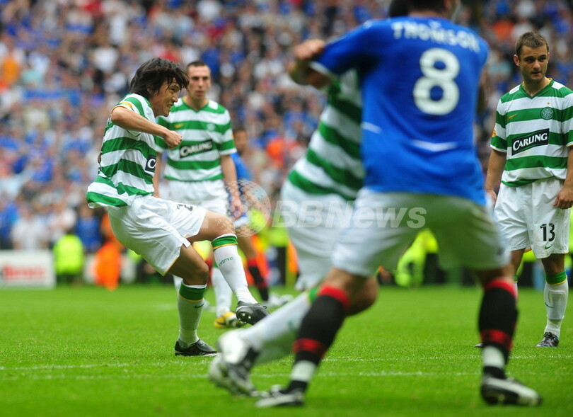 後半に入ると、レンジャーズがケニー・ミラーの2ゴールとペドロ・メンデス(Pedro Mendes)のミドルシュートで立て続けに得点を記録したのに対し、セルティックはロスタイムに中村俊輔(Shunsuke Nakamura)のフリーキックで1点を返すのが精一杯だった。(c)AFP/Alistair Watson