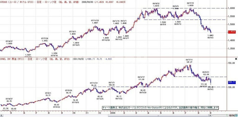 【9月3日 IDO Securities】昨晩は、原油急落(111ドル台から、一時105ドル台に急落)し、ドルも円も上昇、ユーロドルは1.45ドル割れ、ドル円は108円台後半までの上昇となった。NY時間では、ダウが前日比200ドル高で取引を開始したのを受けて、109円台前半まで上昇したが、「原油反発→ダウ反落」する中、108円台半ばに反落。ドルも円も強く、クロス円が下落するという状況が続いている。また、AUD/JPY、NZD/JPYなどは、FX取引を通じた円の買戻しが、もうしばらく続きそうだ。
