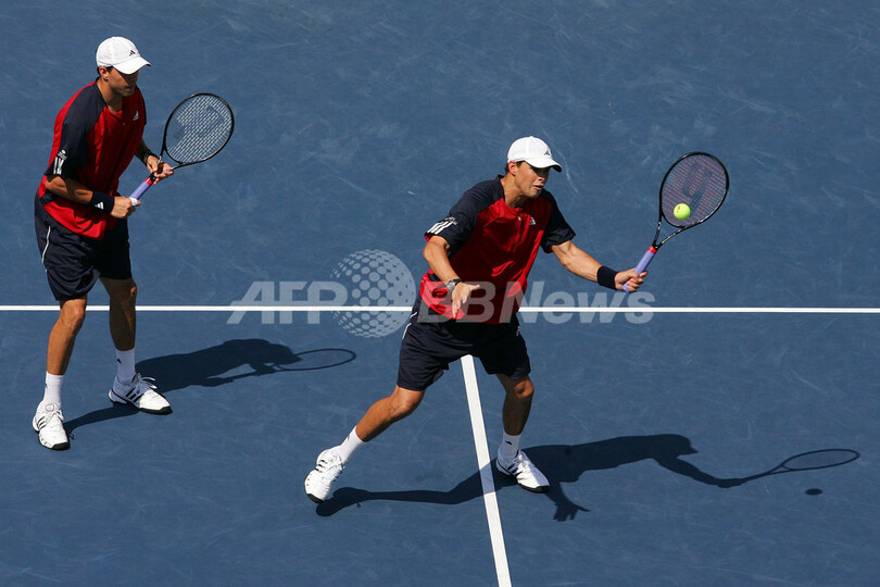 【9月6日 AFP】(写真追加)全米オープンテニス2008(The US Open Tennis Championships 2008)男子ダブルス決勝。大会第2シードのボブ・ブライアン(Bob Bryan、米国)/マイク・ブライアン(Mike Bryan、米国)組は、大会第7シードのルーカス・ドロウヒー(Lukas Dlouhy、チェコ)/リーンダー・パエス(Leander Paes、インド)組と対戦。ブライアン兄弟はセットカウント2-0(7-6、7-6)のストレートでドロウヒー/パエス組を下し、3年ぶり2度目の優勝を飾った。(c)AFP/Getty Images