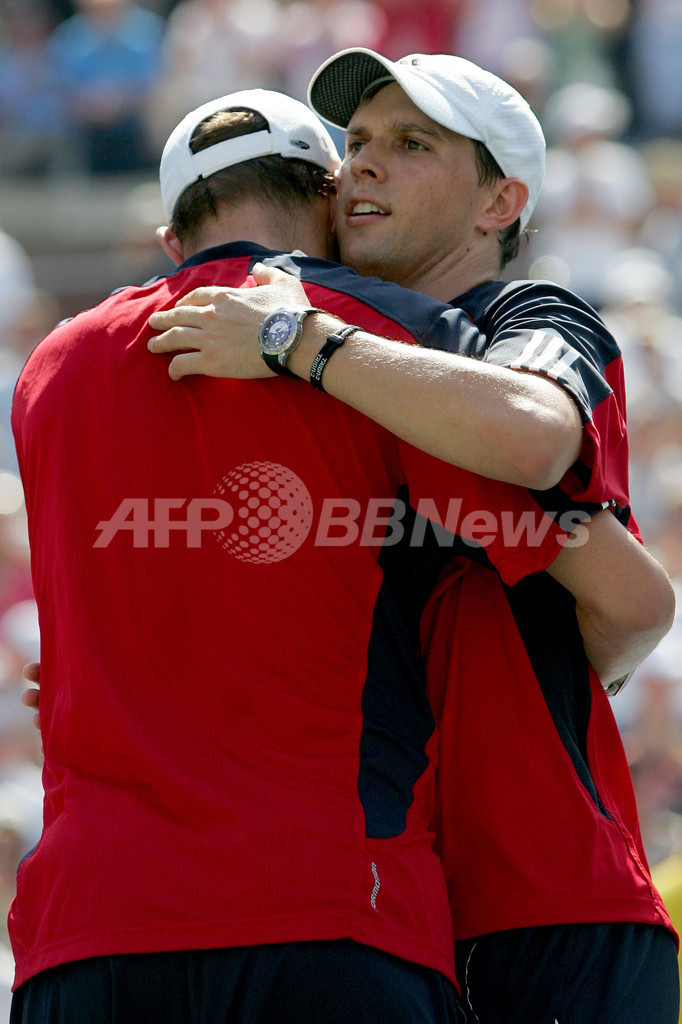 【9月6日 AFP】(写真追加)全米オープンテニス2008(The US Open Tennis Championships 2008)男子ダブルス決勝。大会第2シードのボブ・ブライアン(Bob Bryan、米国)/マイク・ブライアン(Mike Bryan、米国)組は、大会第7シードのルーカス・ドロウヒー(Lukas Dlouhy、チェコ)/リーンダー・パエス(Leander Paes、インド)組と対戦。ブライアン兄弟はセットカウント2-0(7-6、7-6)のストレートでドロウヒー/パエス組を下し、3年ぶり2度目の優勝を飾った。(c)AFP/Getty Images