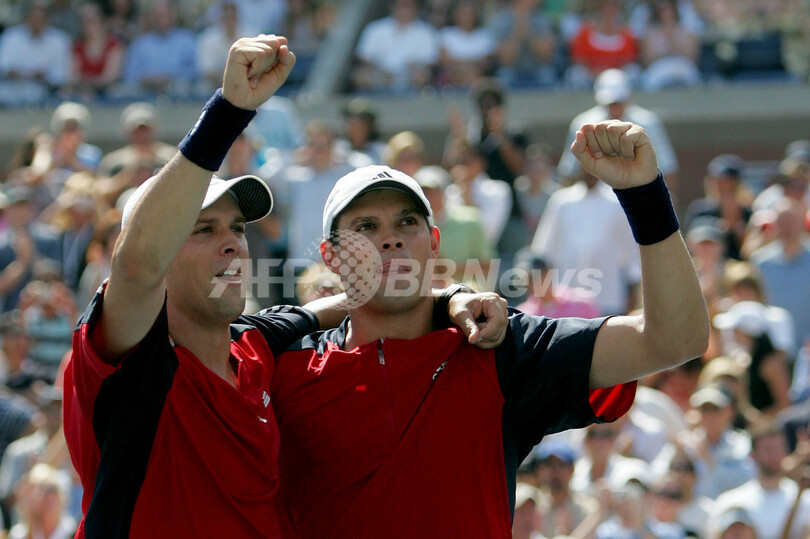 【9月6日 AFP】(写真追加)全米オープンテニス2008(The US Open Tennis Championships 2008)男子ダブルス決勝。大会第2シードのボブ・ブライアン(Bob Bryan、米国)/マイク・ブライアン(Mike Bryan、米国)組は、大会第7シードのルーカス・ドロウヒー(Lukas Dlouhy、チェコ)/リーンダー・パエス(Leander Paes、インド)組と対戦。ブライアン兄弟はセットカウント2-0(7-6、7-6)のストレートでドロウヒー/パエス組を下し、3年ぶり2度目の優勝を飾った。(c)AFP/Getty Images