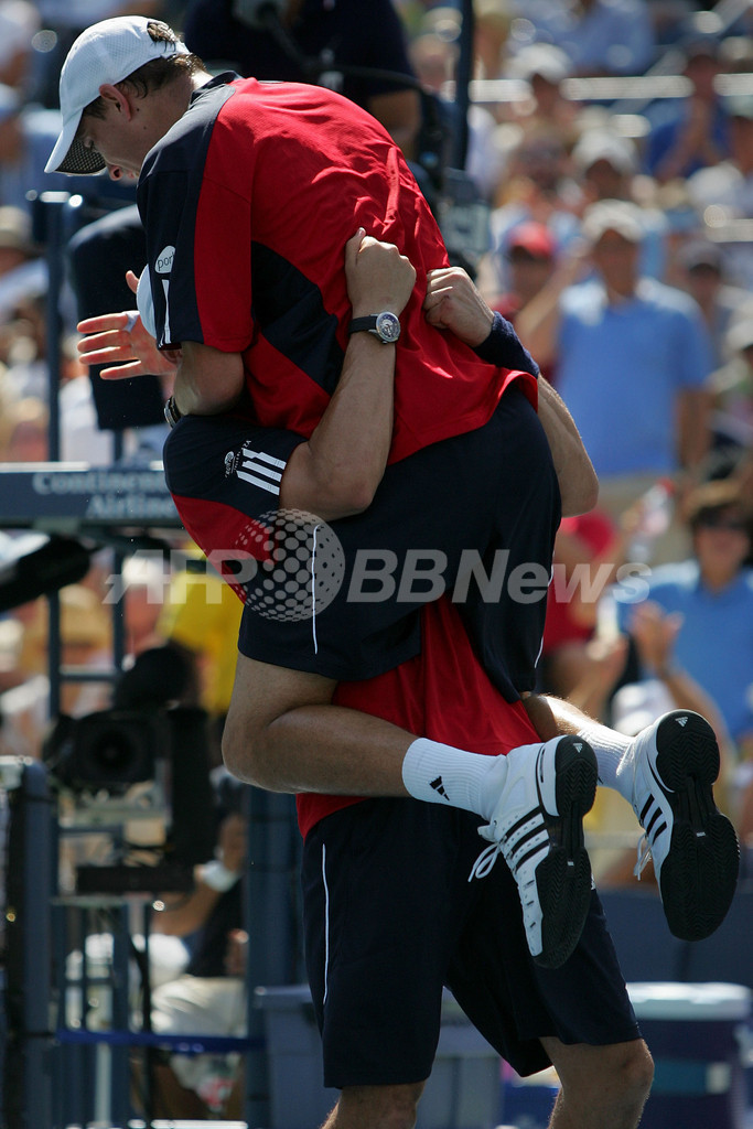 【9月6日 AFP】(写真追加)全米オープンテニス2008(The US Open Tennis Championships 2008)男子ダブルス決勝。大会第2シードのボブ・ブライアン(Bob Bryan、米国)/マイク・ブライアン(Mike Bryan、米国)組は、大会第7シードのルーカス・ドロウヒー(Lukas Dlouhy、チェコ)/リーンダー・パエス(Leander Paes、インド)組と対戦。ブライアン兄弟はセットカウント2-0(7-6、7-6)のストレートでドロウヒー/パエス組を下し、3年ぶり2度目の優勝を飾った。(c)AFP/Getty Images