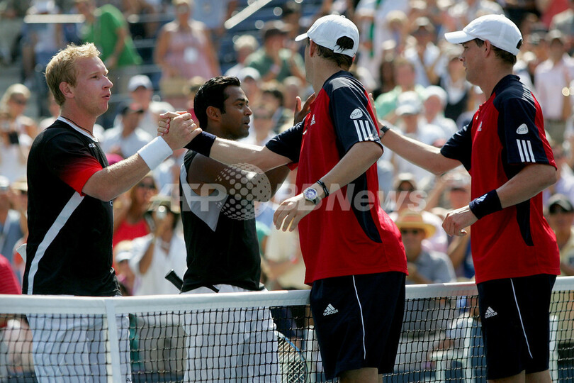 【9月6日 AFP】(写真追加)全米オープンテニス2008(The US Open Tennis Championships 2008)男子ダブルス決勝。大会第2シードのボブ・ブライアン(Bob Bryan、米国)/マイク・ブライアン(Mike Bryan、米国)組は、大会第7シードのルーカス・ドロウヒー(Lukas Dlouhy、チェコ)/リーンダー・パエス(Leander Paes、インド)組と対戦。ブライアン兄弟はセットカウント2-0(7-6、7-6)のストレートでドロウヒー/パエス組を下し、3年ぶり2度目の優勝を飾った。(c)AFP/Getty Images