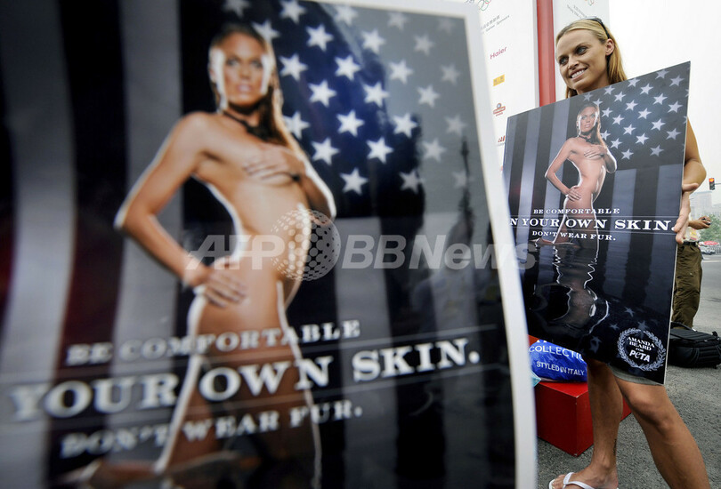 【8月6日 AFP】(7日 一部更新)北京五輪開幕まで2日に迫った北京(Beijing)の選手村(Olympic Village)で6日、米国選手団主将で五輪2大会金メダリストの女子競泳アマンダ・ビアード(Amanda Beard)選手が、同選手のヌード写真を使った国際動物愛護団体「動物の倫理的扱いを求める人々の会(People For The Ethical Treatment of AnimalsPETA)」の毛皮反対キャンペーンの新しい宣伝用ポスターを披露した。