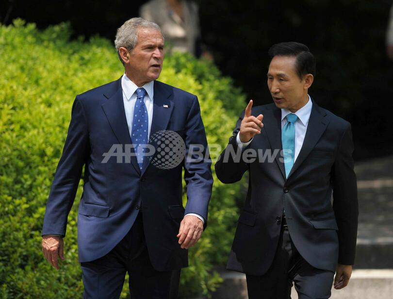 【8月6日 AFP】(8月7日 写真追加)米国のジョージ・W・ブッシュ(George W. Bush)大統領は6日、今週末の北京五輪開会式に向かう途上、韓国ソウル(Seoul)で李明博(イ・ミョンバク、Lee Myung-Bak)大統領と首脳会談を行った後、中国と北朝鮮の人権侵害を批判した。