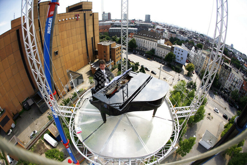 【8月11日 AFP】ドイツ北部のハンブルク(Hamburg)で、クレーンで空中高くに吊り上げられたステージの上で、ゲストのために料理を作る2人のシェフ。