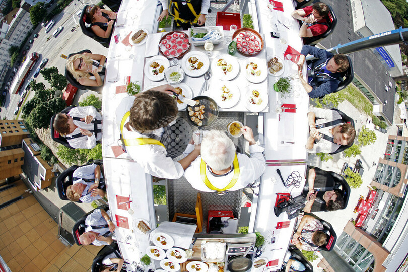 【8月11日 AFP】ドイツ北部のハンブルク(Hamburg)で、クレーンで空中高くに吊り上げられたステージの上で、ゲストのために料理を作る2人のシェフ。