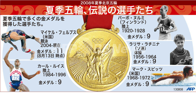 五輪 【図解】夏季五輪 伝説の選手たち 2008年8月14日 17:41 発信地:北京/中国 [ 中国・台湾 中国 ] このニュースをシェア (c)AFP 【8月14日 AFP】図は、北京五輪で、現段階で過去最多数の金メダルを獲得しているマイケル・フェルプス(Michael Phelps)と、彼以前に多くの金メダルを獲得した選手たちについて示したもの。(c)AFP<ニュース解説画像一覧へ> 五輪 一覧へ> メディア・報道関係・法人の方向け 写真・動画 購入のお問合せ>