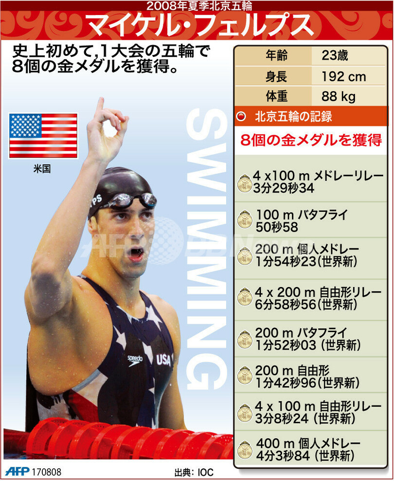 五輪 図解 【図解】北京五輪・競泳、フェルプスが8冠 2008年8月18日 11:10 発信地:北京/中国 [ 中国・台湾 中国 ] このニュースをシェア (c)AFP 【8月18日 AFP】図は、北京五輪で8個の金メダルを獲得したマイケル・フェルプス(Micheal Phelps)について示したもの。(c)AFP<ニュース解説画像一覧へ> 五輪 一覧へ> メディア・報道関係・法人の方向け 写真・動画 購入のお問合せ>