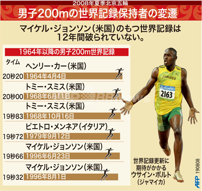 五輪 図解 【図解】1964年以降の男子200m世界記録保持者の変遷 2008年8月20日 20:49 発信地:北京/中国 [ 中国・台湾 中国 ] このニュースをシェア (c)AFP 【8月20日 AFP】図は、1964年以降の男子200m世界記録保持者の変遷について示したもの。(c)AFP<ニュース解説画像一覧へ> 五輪 一覧へ> メディア・報道関係・法人の方向け 写真・動画 購入のお問合せ>