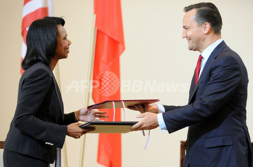 【8月20日 AFP】(写真追加)ポーランドの首都ワルシャワ(Warsaw)で公式式典に出席した米国のコンドリーザ・ライス(Condoleezza Rice)国務長官とポーランドのラドスワフ・シコルスキ(Radoslaw Sikorski)外相は20日、米ミサイル防衛の一部施設をポーランドに配備する合意文書に調印した。