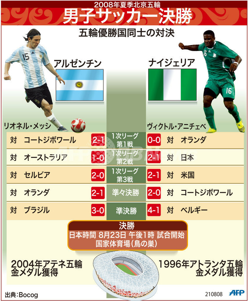 五輪 図解 【図解】北京五輪、男子サッカー決勝進出チーム 2008年8月22日 12:44 発信地:北京/中国 [ 中国・台湾 中国 ] このニュースをシェア (c)AFP 【8月22日 AFP】図は、日本時間23日午後1時開始予定の、北京五輪男子サッカー決勝戦に進出するチームについて示したもの。(c)AFP<ニュース解説画像一覧へ> 五輪 一覧へ> メディア・報道関係・法人の方向け 写真・動画 購入のお問合せ>