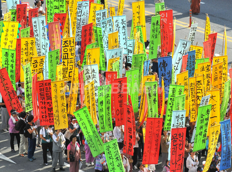 【8月27日 AFP】仏教の僧侶ら数万人が27日、韓国の李明博(イ・ミョンバク、Lee Myung-Bak)政権がキリスト教を優遇しているとして、ソウル(Seoul)中心部をデモ行進した。
