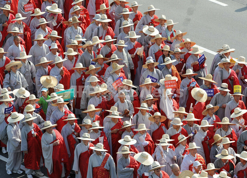 【8月27日 AFP】仏教の僧侶ら数万人が27日、韓国の李明博(イ・ミョンバク、Lee Myung-Bak)政権がキリスト教を優遇しているとして、ソウル(Seoul)中心部をデモ行進した。