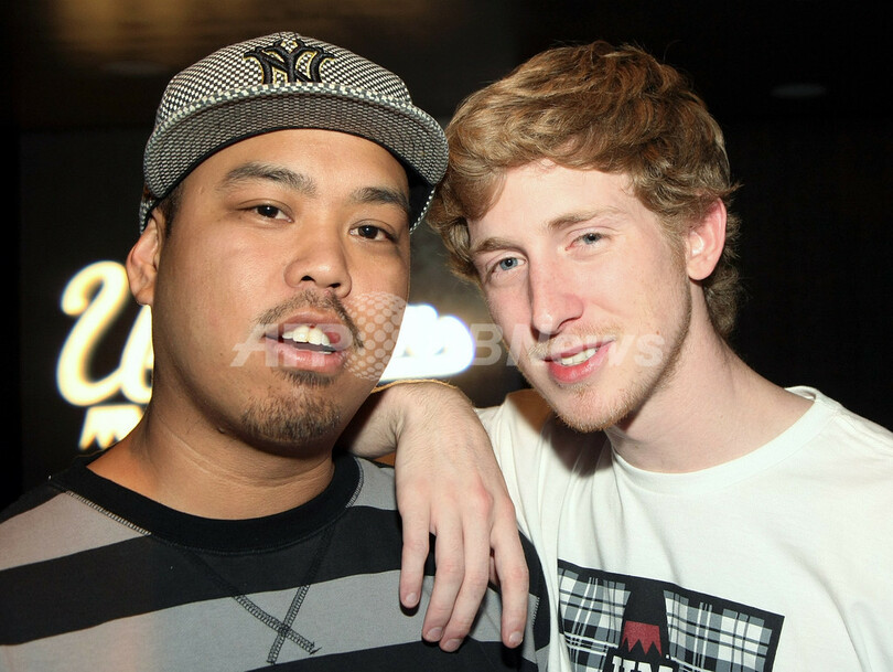 米ネバダ(Nevada)州ラスベガス(Las Vegas)のパームス・カジノ・リゾート(Palms Casino Resort)で行われたファッションブランドUndrcrwnのパーティーに登場した、同ブランドクリエイティブディレクターのDustin Canalin(左)とラッパーのアッシャー・ロス(Asher Roth、2008年8月27日撮影)。(c)AFP/Getty Images/Ethan Miller