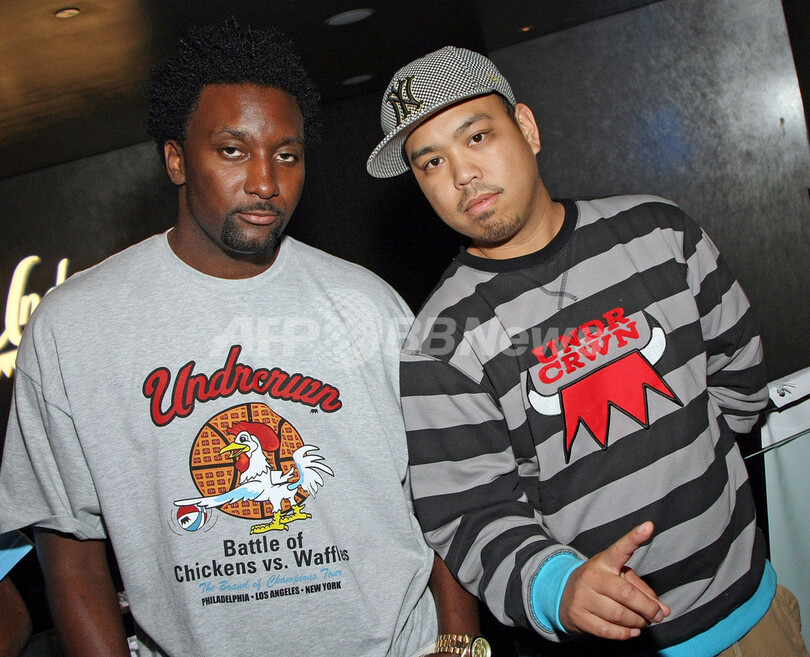米ネバダ(Nevada)州ラスベガス(Las Vegas)のパームス・カジノ・リゾート(Palms Casino Resort)で行われたファッションブランドUndrcrwnのパーティーに登場した、同ブランドクリエイティブディレクターのDustin Canalin(右)とラッパーのDamani(2008年8月27日撮影)。(c)AFP/Getty Images/Ethan Miller