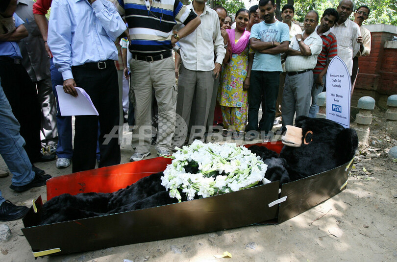【8月30日 AFP】国際動物愛護団体「動物の倫理的扱いを求める人々の会(People for the Ethical Treatment of Animals、PETA)」は28日、動物園は動物を死に至らしめるわなだとして、インドの首都ニューデリー(New Delhi)にある中央動物園当局前で抗議デモを行った。メンバーはクマの着ぐるみを着てひつぎに横たわった。