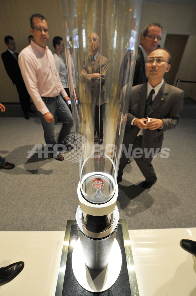 ソニーが開発した、有機ガラス管を振動させて360度方向へ音楽を再生するスピーカーシステム、「Sountina(サウンティーナ)」などが注目を集めた。(c)AFP