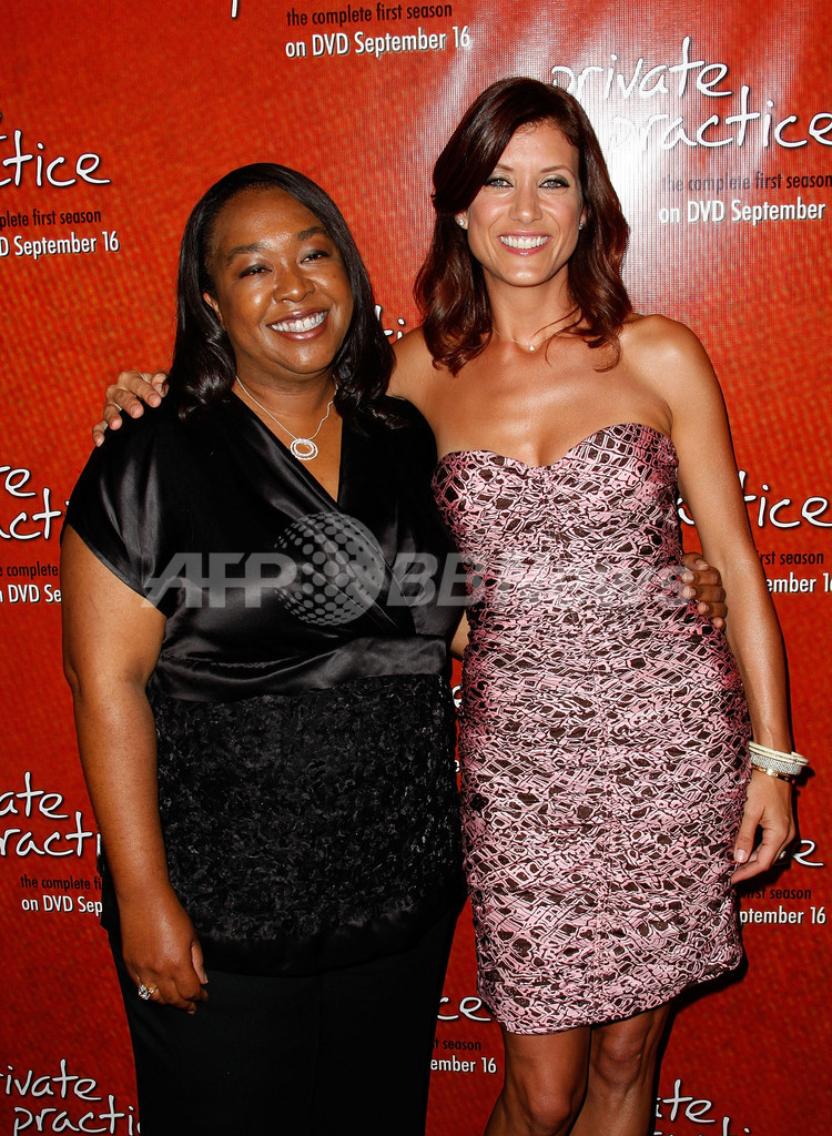 ハリウッド(Hollywood)で開催されたTVドラマ「Private Practice」シーズン1のコンプリート版DVDの発売記念パーティーに登場した、プロデューサーのションダ・ライムズ(Shonda Rhimes、左) 、出演女優のケイト・ウォルシュ(Kate Walsh、2008年9月2日撮影)。(c)AFP/Getty Images/Michael Buckner