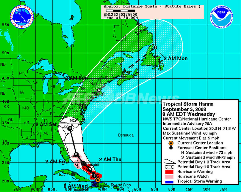 3日夜の時点で、ハンナの勢力は最大風速は約29.4メートル、中心はバハマ・サンサルバドル島の東南320キロの海上にあり、時速22キロ前後で北上中。今後、勢力を強め、ハリケーンに成長する可能性がある。バハマ諸島では全島で非常警報が発令された。