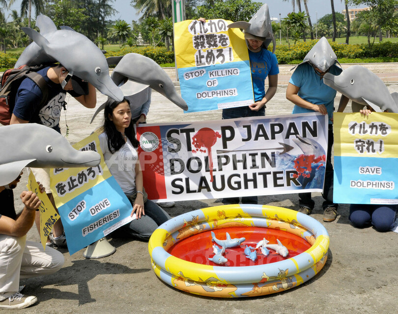 同日、ワシントンD.C.の日本大使館前ではイルカに扮(ふん)した保護団体メンバーがやりで突かれて死に道に横たわるというパフォーマンスを実演しながら、日本は残虐な行為をやめるべきだと主張した。