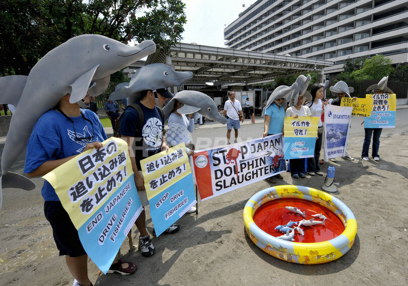 同日、ワシントンD.C.の日本大使館前ではイルカに扮(ふん)した保護団体メンバーがやりで突かれて死に道に横たわるというパフォーマンスを実演しながら、日本は残虐な行為をやめるべきだと主張した。