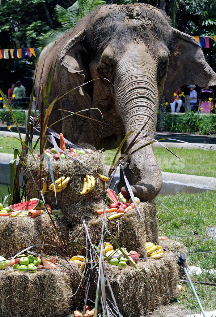 Zoo of Santa Fe)で6日、67歳の誕生日を迎えバースデーケーキをほおばるゾウの