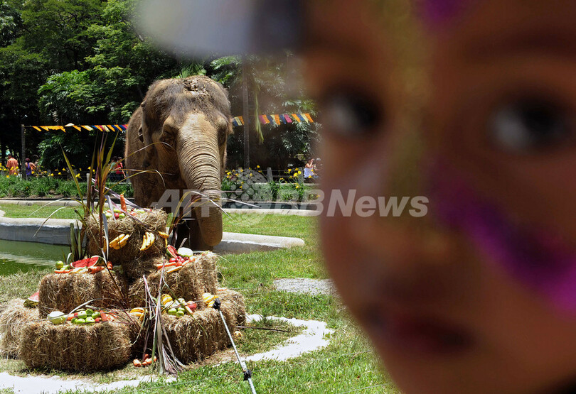 コロンビア・アンティオキア(Antioquia)州メデジン(Medellin)にあるサンタフェ動物園(Zoo of Santa Fe)で、67歳の誕生日を迎え、ケーキをほおばるゾウのLady(2008年9月6日撮影)。(c)AFP/Raul ARBOLEDA