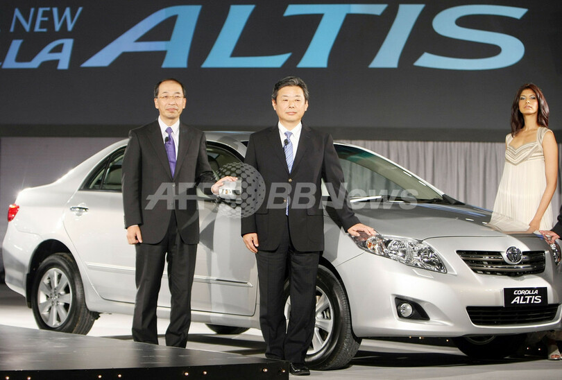 インドの首都ニューデリー(New Delhi)から約30キロのノイダ(Noida)で開かれた発表会で「カローラ アルティス(Carolla Altis)」を披露するトヨタ自動車(Toyota Motor)の奥平総一郎(Soichiro Okudaira)第2トヨタセンター・エグゼクティブチーフエンジニア(ECE、左)とトヨタ・キルロスカ・モーター(Toyota Kirloskar Motor Private、TKM)の中川弘(Hiroshi Nakagawa)社長(2008年9月5日撮影)。(c)AFP/Manan VATSYAYANA