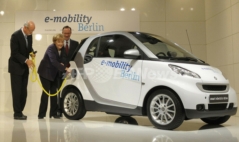 【9月9日 AFP】ドイツ自動車大手ダイムラー(Daimler)とエネルギー大手は5日、温暖化防止のため電気自動車の普及推進を目指す事業計画「E-Mobility Berlin」を発表。ベルリン(Berlin)市内約50か所に充電スタンドを設け、ガソリン車の排出する二酸化炭素の削減を目指す。ダイムラーは英ロンドン(London)でも電気自動車普及事業を実施しており、今回の計画はこれに続くものとなる。ベルリン(Berlin)で開かれた発表会見にはアンゲラ・メルケル(Angela Merkel)首相、ダイムラーのディーター・ツェッチェ(Dieter Zetsche)最高経営責任者(CEO)、ドイツ自動車工業会(Verband der Automobilindustrie、VDA)のマティアス・ビスマン(Matthias Wissmann)会長らが出席した。(c)AFP