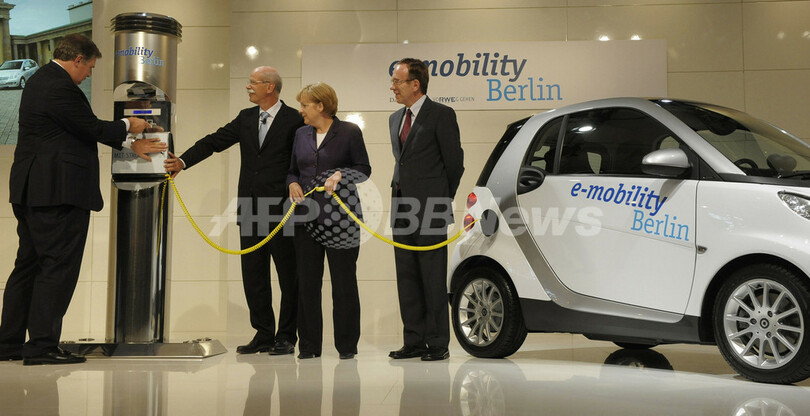 【9月9日 AFP】ドイツ自動車大手ダイムラー(Daimler)とエネルギー大手は5日、温暖化防止のため電気自動車の普及推進を目指す事業計画「E-Mobility Berlin」を発表。ベルリン(Berlin)市内約50か所に充電スタンドを設け、ガソリン車の排出する二酸化炭素の削減を目指す。ダイムラーは英ロンドン(London)でも電気自動車普及事業を実施しており、今回の計画はこれに続くものとなる。ベルリン(Berlin)で開かれた発表会見にはアンゲラ・メルケル(Angela Merkel)首相、ダイムラーのディーター・ツェッチェ(Dieter Zetsche)最高経営責任者(CEO)、ドイツ自動車工業会(Verband der Automobilindustrie、VDA)のマティアス・ビスマン(Matthias Wissmann)会長らが出席した。(c)AFP
