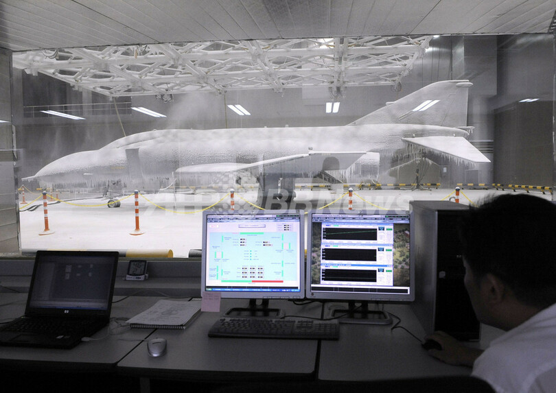 韓国ソウル(Seoul)南西150キロの瑞山(Seosan)市に開設された航空機試験施設「Air-Weapons Systems Testing Center(空中兵器システム実験場)」の気候室で、F4E「ファントム(Phantom)」戦闘機の異常気象下での性能試験を行う職員(2008年9月8日撮影)。(c)AFP/JUNG YEON-JE