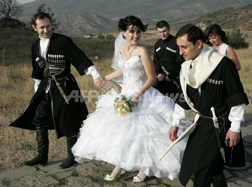 ニュース ライフ グルジア伝統の婚礼衣装で挙式のカップル 2008年9月10日 10:16 発信地:ムツヘタ/ジョージア [ ロシア・CIS ジョージア ] このニュースをシェア グルジアの首都トビリシ(Tbilisi)から約20キロのムツヘタ(Mtskheta)で、伝統的な婚礼衣装に身を包んだ新郎新婦(2008年9月7日撮影)。(c)AFP/ VANO SHLAMOV 【9月10日 AFP】グルジアのムツヘタ(Mtskheta)で、伝統的な婚礼衣装に身を包み結婚式を挙げたばかりの新郎新婦。(c)AFP ライフ 一覧へ> メディア・報道関係・法人の方向け 写真・動画 購入のお問合せ>