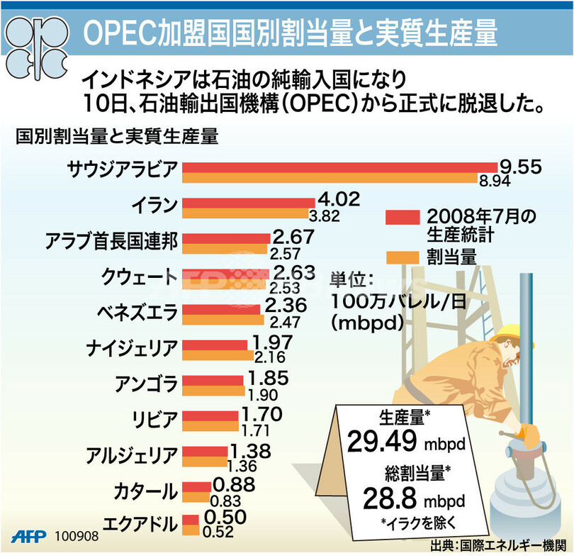 ニュース 政治・経済 図解 【図解】OPEC加盟国国別割当量と実質生産量 2008年9月11日 10:12 発信地:オーストリア [ ヨーロッパ オーストリア ] このニュースをシェア (c)AFP 【9月11日 AFP】図は、石油輸出国機構(Organization of the Petroleum Exporting Countries、OPEC)加盟国の石油の国別割当量と実質生産量を示したもの。(c)AFP<ニュース解説画像一覧へ> 政治・経済 一覧へ> メディア・報道関係・法人の方向け 写真・動画 購入のお問合せ>