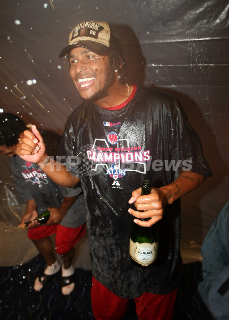 【9月10日 AFP】08MLB、ロサンゼルス・エンゼルス・オブ・アナハイム(Los Angeles Angels of Anaheim)対ニューヨーク・ヤンキース(New York Yankees)。試合はエンゼルスが4-2でヤンキースを下し、2年連続のア・リーグ西地区優勝を果たした。