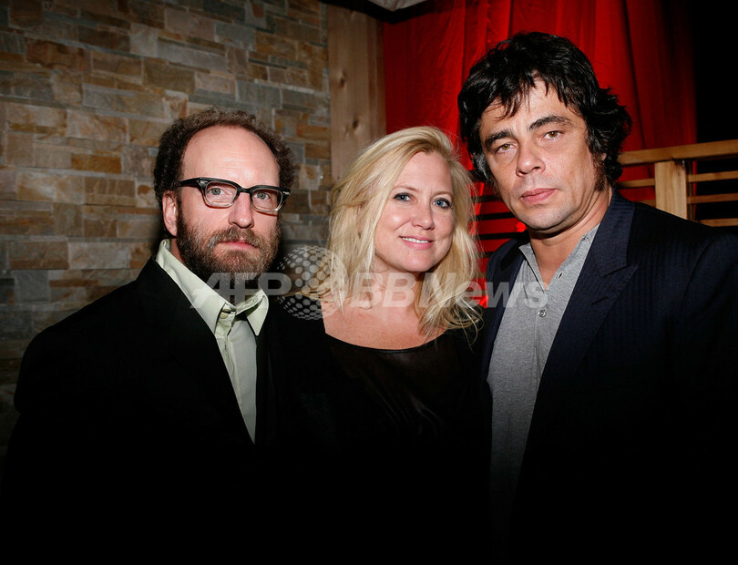 第33回トロント国際映画祭(Toronto International Film Festival)で行われた映画『チェ 28歳の革命/原題:Che (Part 1)』のプレミア上映会アフターパーティーに登場した、(左から)監督のスティーヴン・ソダーバーグ(Steven Soderbergh)、プロデューサーのローラ・ビックフォード(Laura Bickford)、出演俳優のベニチオ・デル・トロ(Benicio Del Toro、2008年9月9日撮影)。(c)AFP/Getty Images/Malcolm Taylor