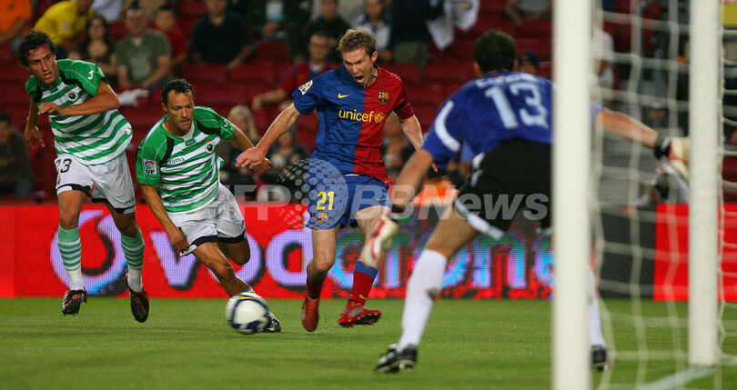 【9月14日 AFP】08-09スペイン1部リーグ第2節、FCバルセロナ(FC Barcelona)対ラシン・サンタンデール(Racing Santander)。試合は後半25分にリオネル・メッシ(Lionel Messi)がPKを決めてバルセロナが先制したが、同31分にホナタン・ペレイラ(Jonathan Pereira Rodriguez)に同点ゴールを決められ1-1の引き分けに終わり、バルセロナは本拠地でのリーグ開幕戦を白星で飾ることができなかった。(c)AFP/Phil Seery