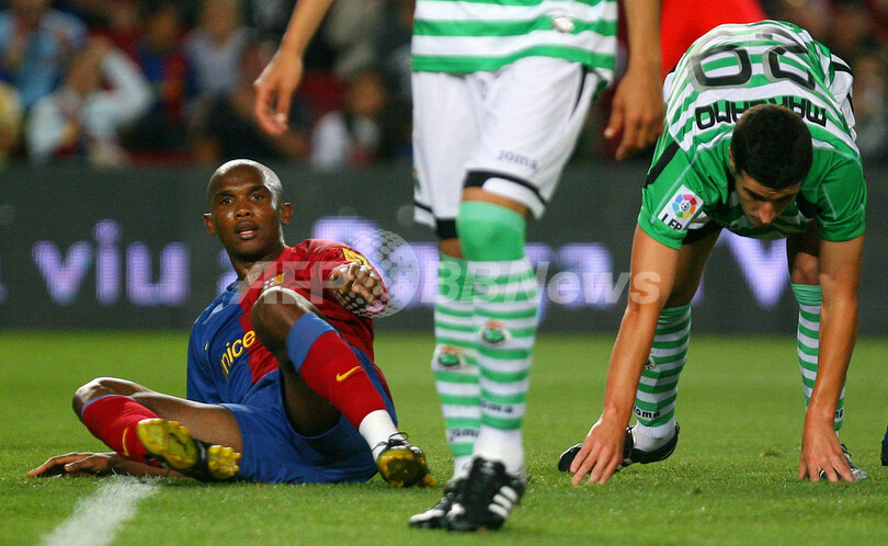 【9月14日 AFP】08-09スペイン1部リーグ第2節、FCバルセロナ(FC Barcelona)対ラシン・サンタンデール(Racing Santander)。試合は後半25分にリオネル・メッシ(Lionel Messi)がPKを決めてバルセロナが先制したが、同31分にホナタン・ペレイラ(Jonathan Pereira Rodriguez)に同点ゴールを決められ1-1の引き分けに終わり、バルセロナは本拠地でのリーグ開幕戦を白星で飾ることができなかった。(c)AFP/Phil Seery