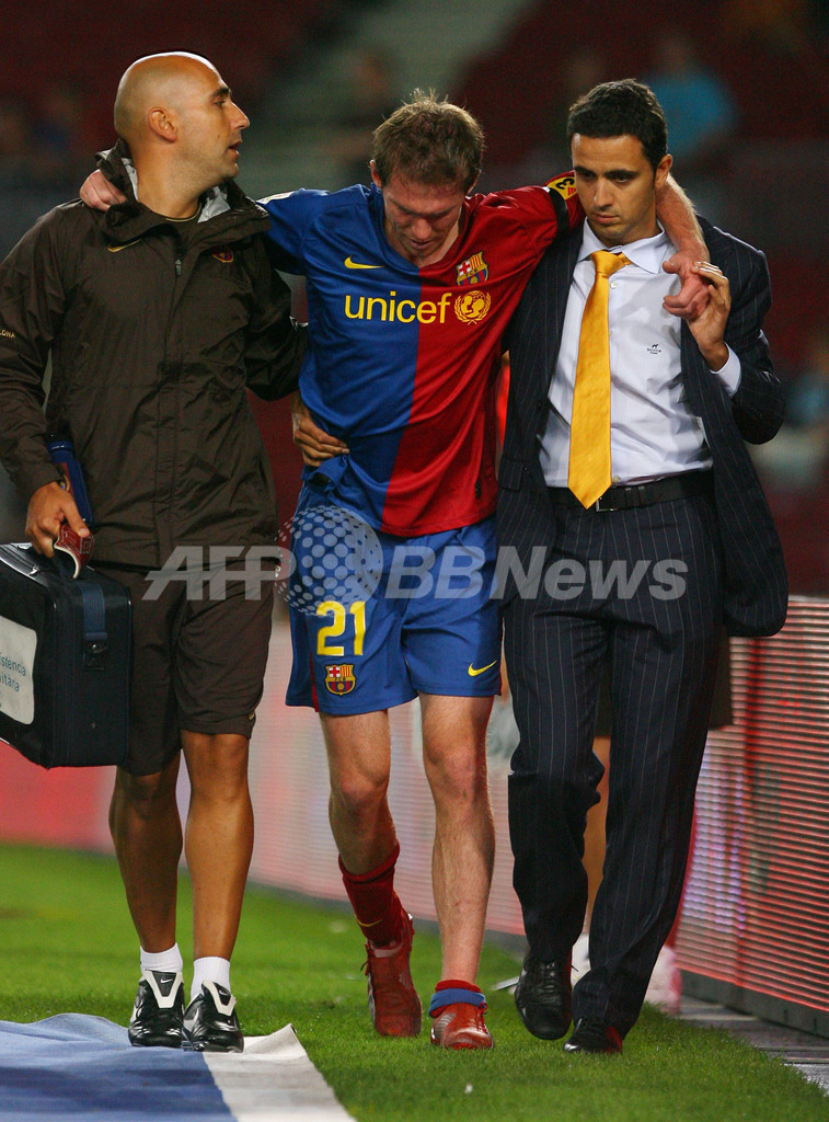 【9月14日 AFP】08-09スペイン1部リーグ第2節、FCバルセロナ(FC Barcelona)対ラシン・サンタンデール(Racing Santander)。試合は後半25分にリオネル・メッシ(Lionel Messi)がPKを決めてバルセロナが先制したが、同31分にホナタン・ペレイラ(Jonathan Pereira Rodriguez)に同点ゴールを決められ1-1の引き分けに終わり、バルセロナは本拠地でのリーグ開幕戦を白星で飾ることができなかった。(c)AFP/Phil Seery